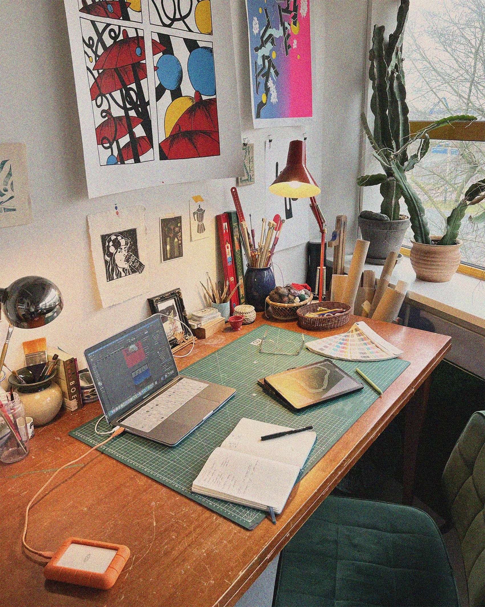 Ilse often works with risoprint, screenprint or blockprint. Overall the look that analog print can add to a design, plays a big role in the process. On a daily basis when she works on a project she always works analog first, and sketches out the ideas and then adds some extra details digitally. Her medium of choice would be ink and pencil, colored in digitally via Photoshop.